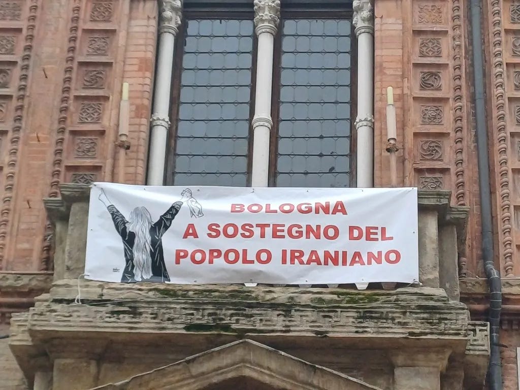 In January, a banner was installed on the façade of Palazzo d’Accursio in Bologna, Italy. The drawing was dedicated to the Iranian people.