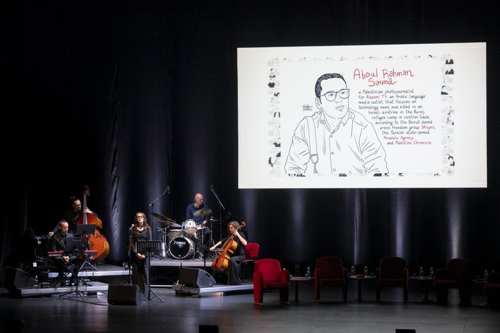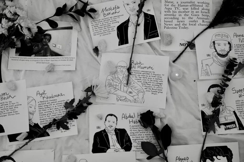Throughout 2023 and 2024, my illustrations have been featured in numerous international events, amplifying messages of solidarity and resistance. At the NPF Journalism Awards Dinner in Washington D.C. in February 2024, my works were projected before hundreds of journalists, honoring the sacrifice of those who lost their lives reporting uncomfortable truths. The same spirit fueled vigils in memory of journalists killed during the Israel-Hamas war, such as those held in Seattle, Naples, and Atlanta in December 2023, where my drawings served as visual symbols to honor their dedication and courage.